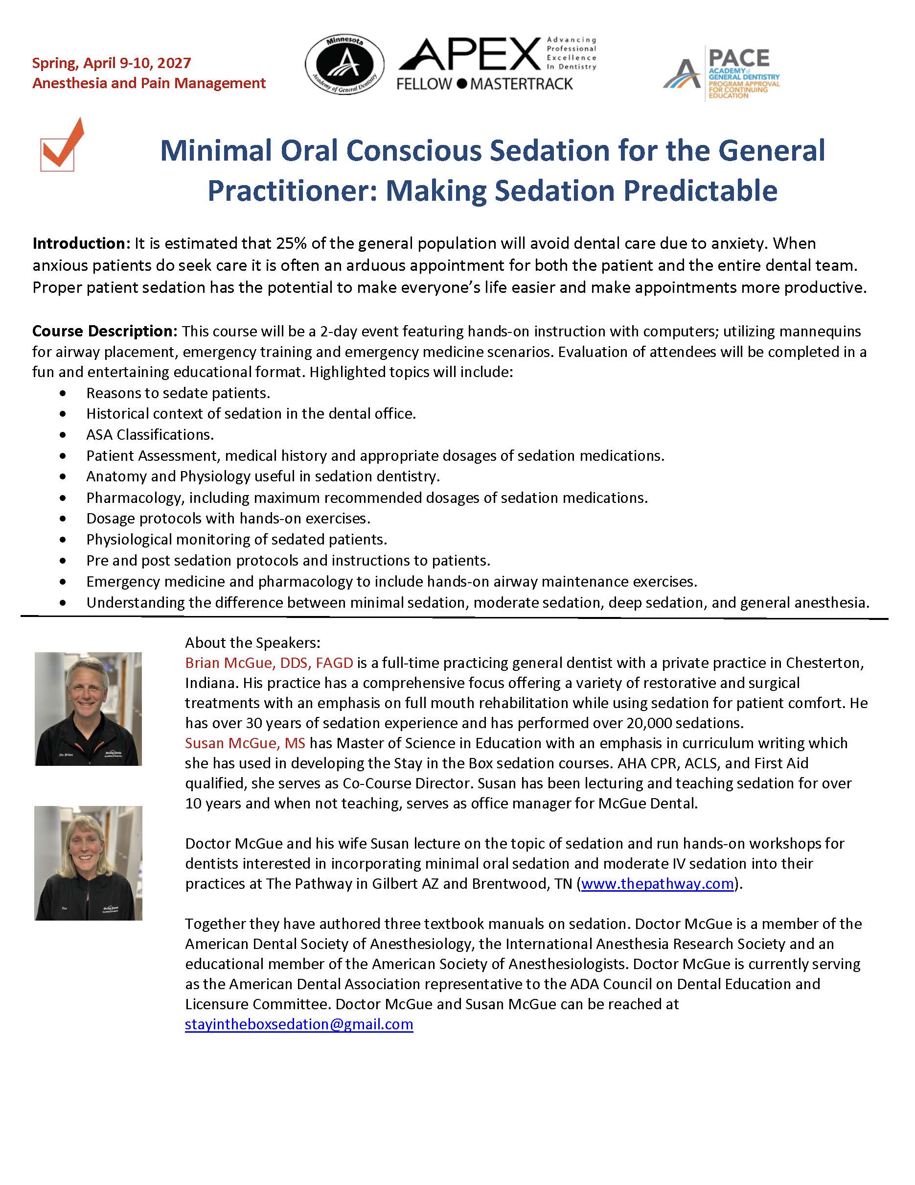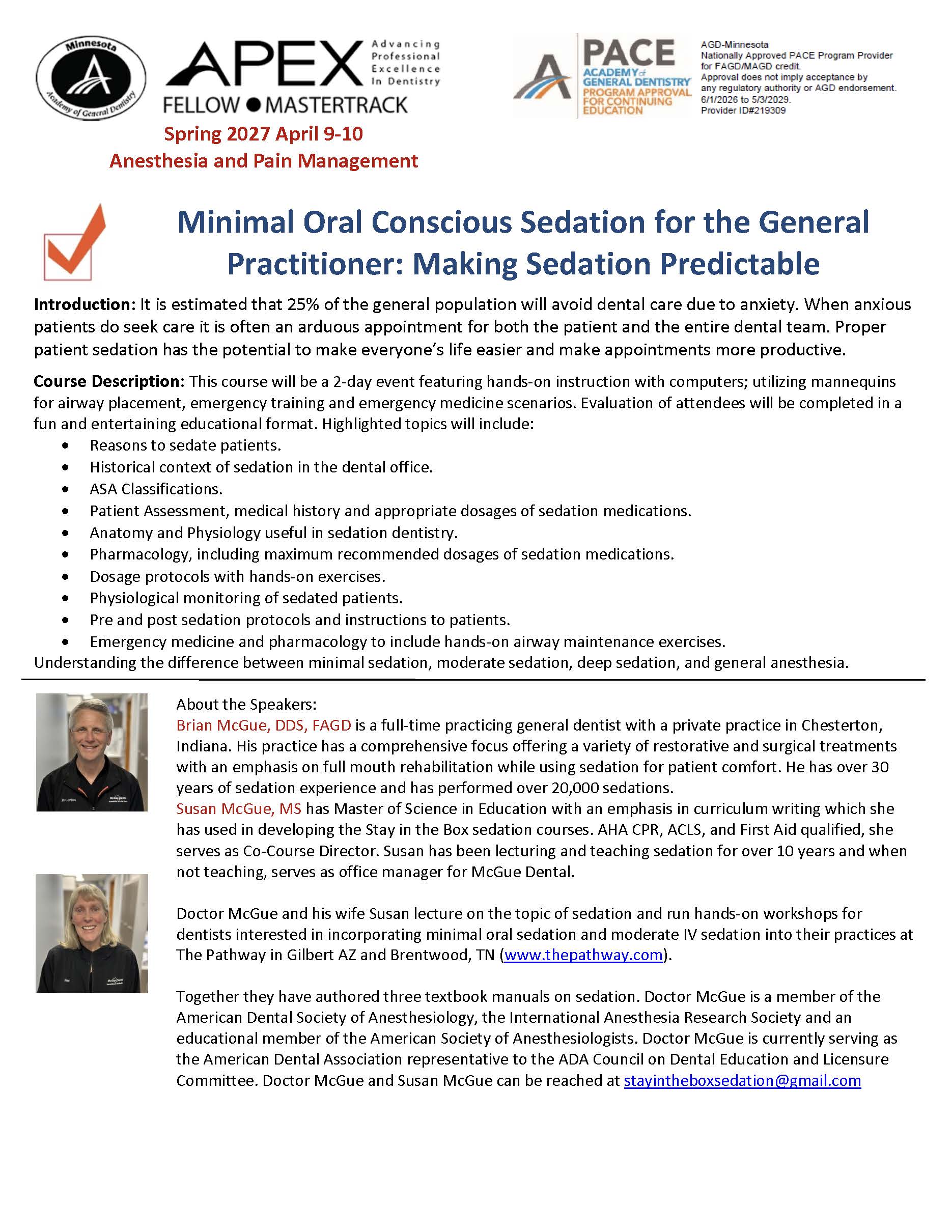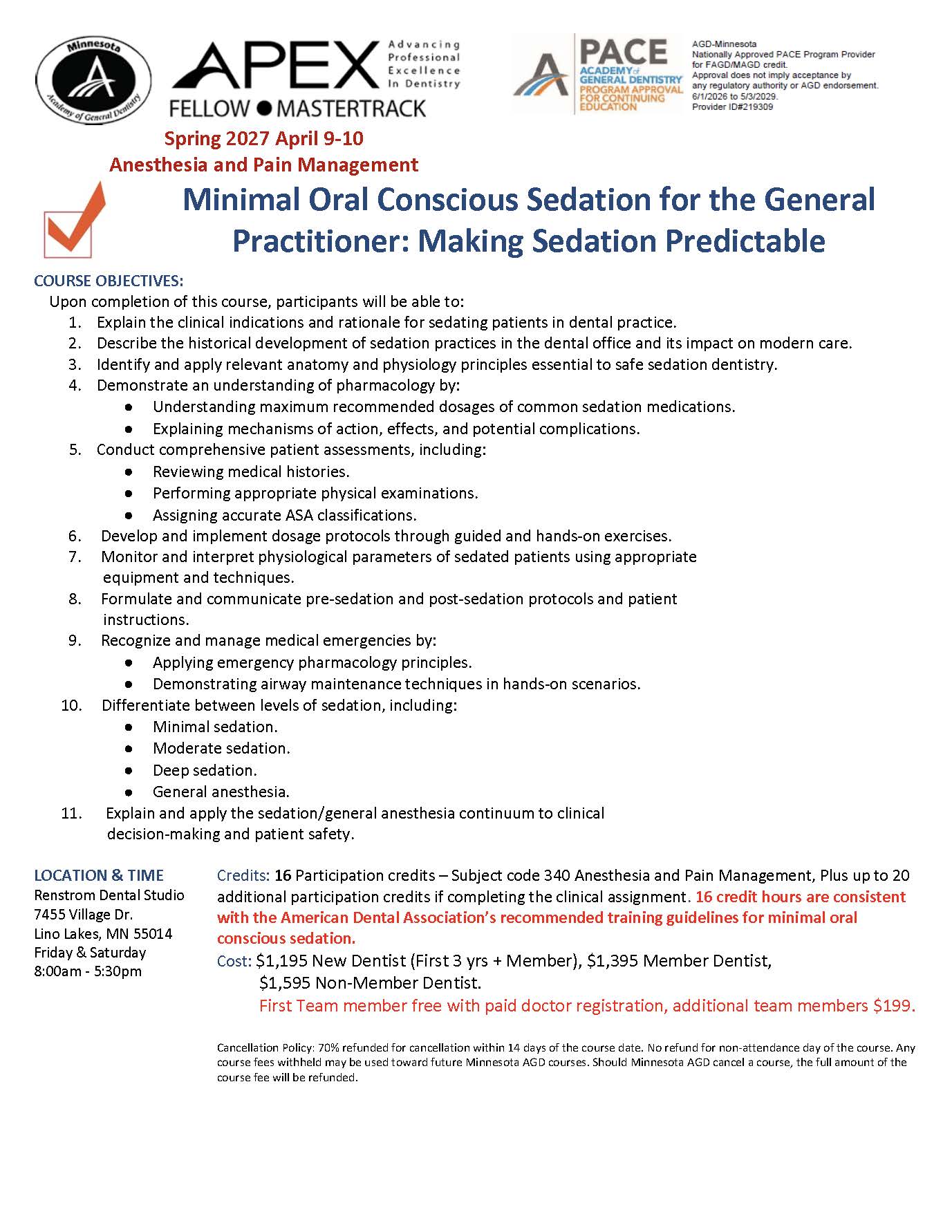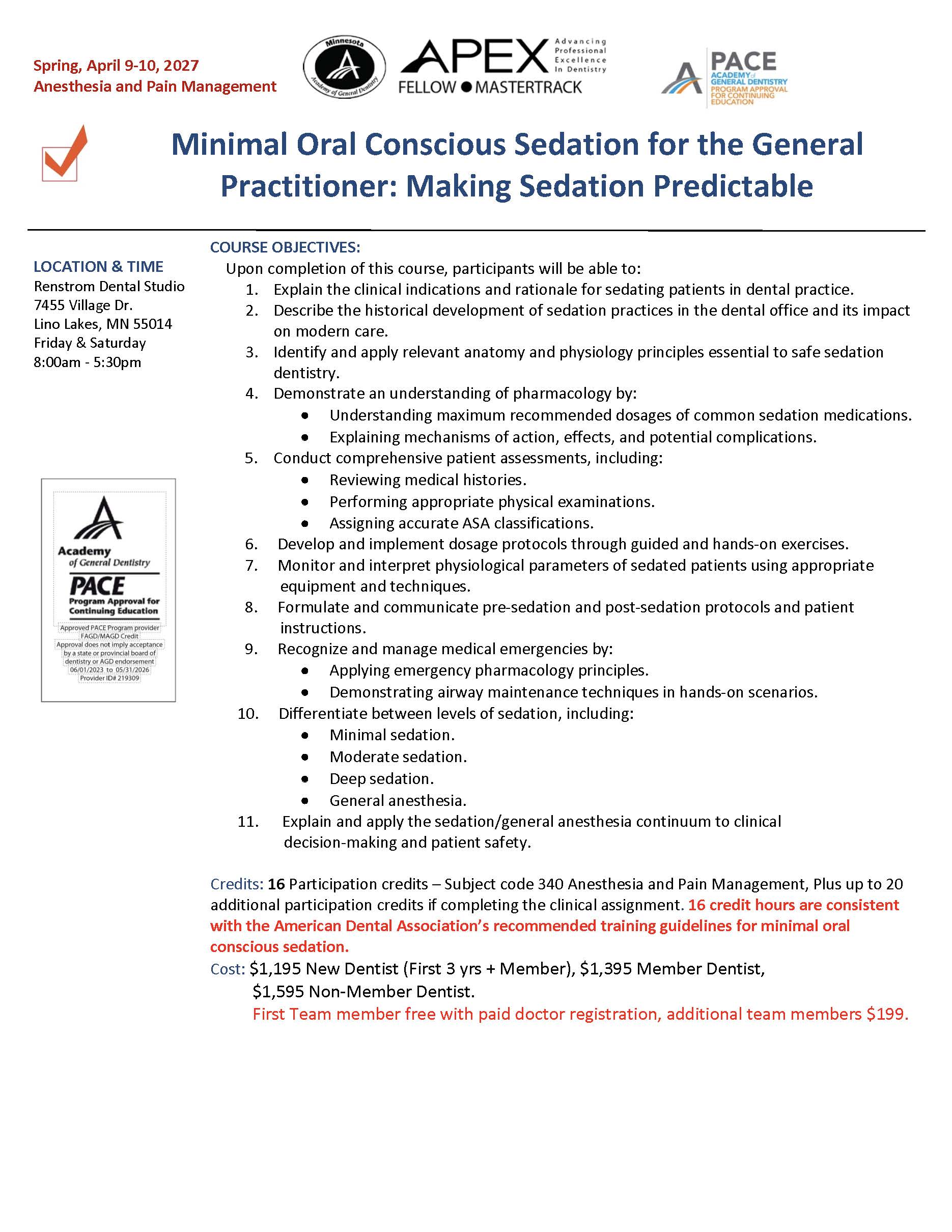 April 9-10, 2027: Minimal Oral Conscious Sedation for the General Practitioner: Making Sedation Predictable Who is attending? New AGD Grad (first 3 yrs + member) $1,195.00 USDAGD Member Dentist $1,395.00 USDNon-AGD Member Dentist $1,595.00 USDAdditional Team Member $199.00 USD Attender’s Name AGD Members, Please Provide Your Member Number: